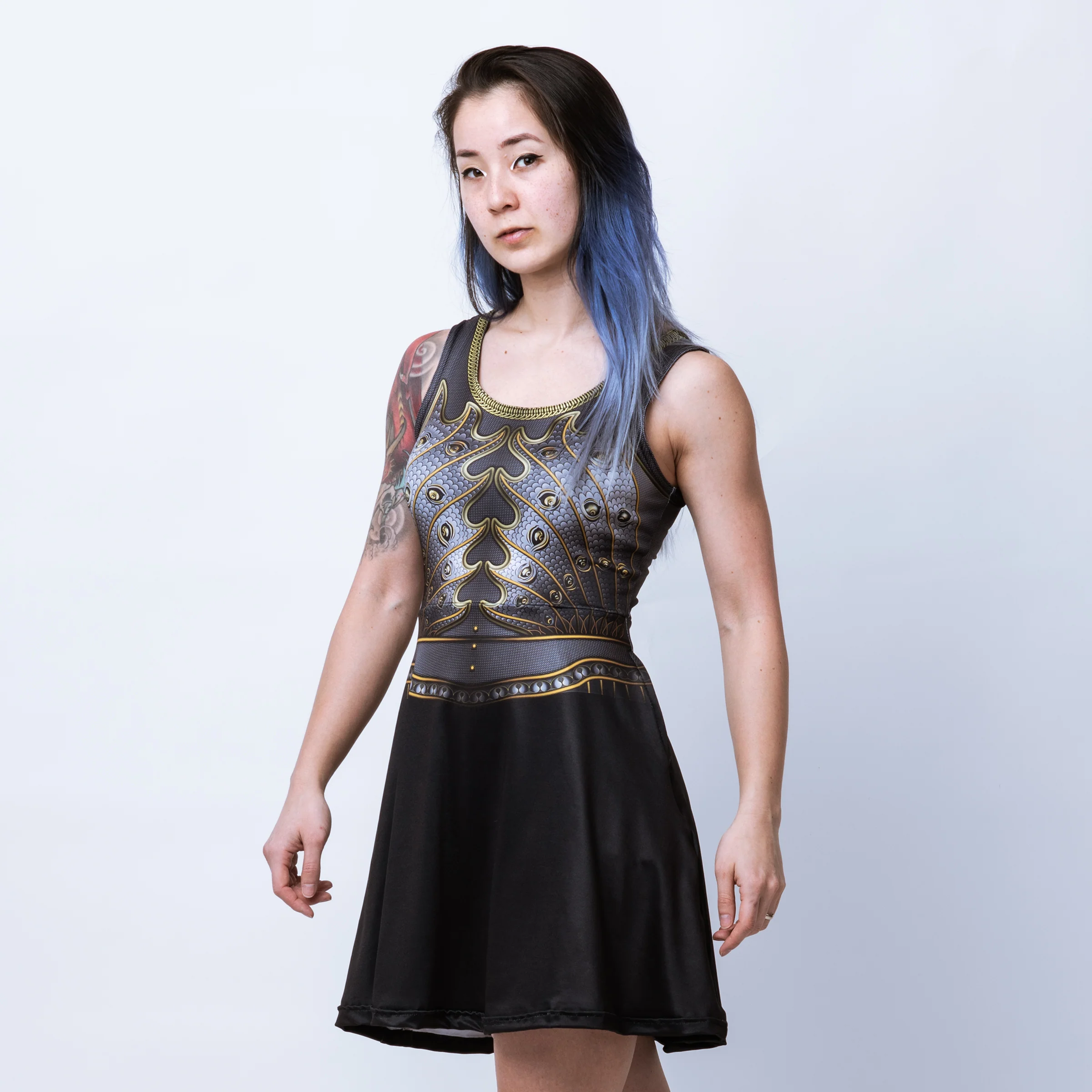 Lorica skater dresses feature two hidden side seam pockets, and are available in three lengths ("knife," "sword," and "lance," in order from shortest to longest. There is a difference of 3" between each).